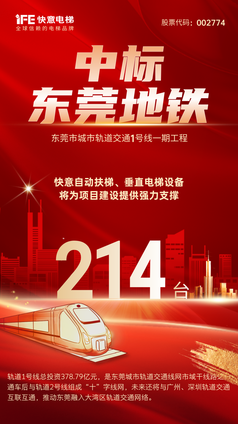 重大捷報|214臺!快意電梯中標東莞地鐵1號線